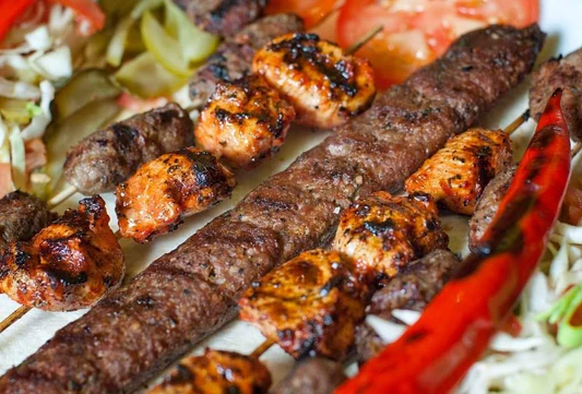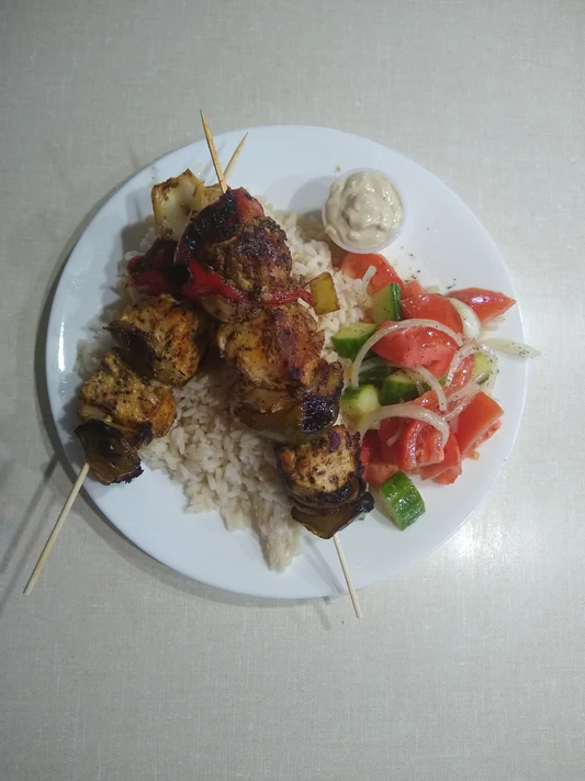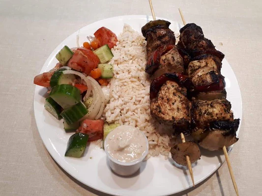 Marinated and grilled chicken cubes served with grilled vegetables, rice or fries, tomia, tahini sauce and green salad