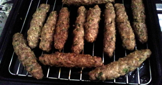Grilled ground beef marinated in the shape of a finger, accompanied by rice, tomis, Tahini sauce and salad
